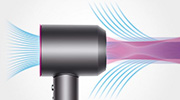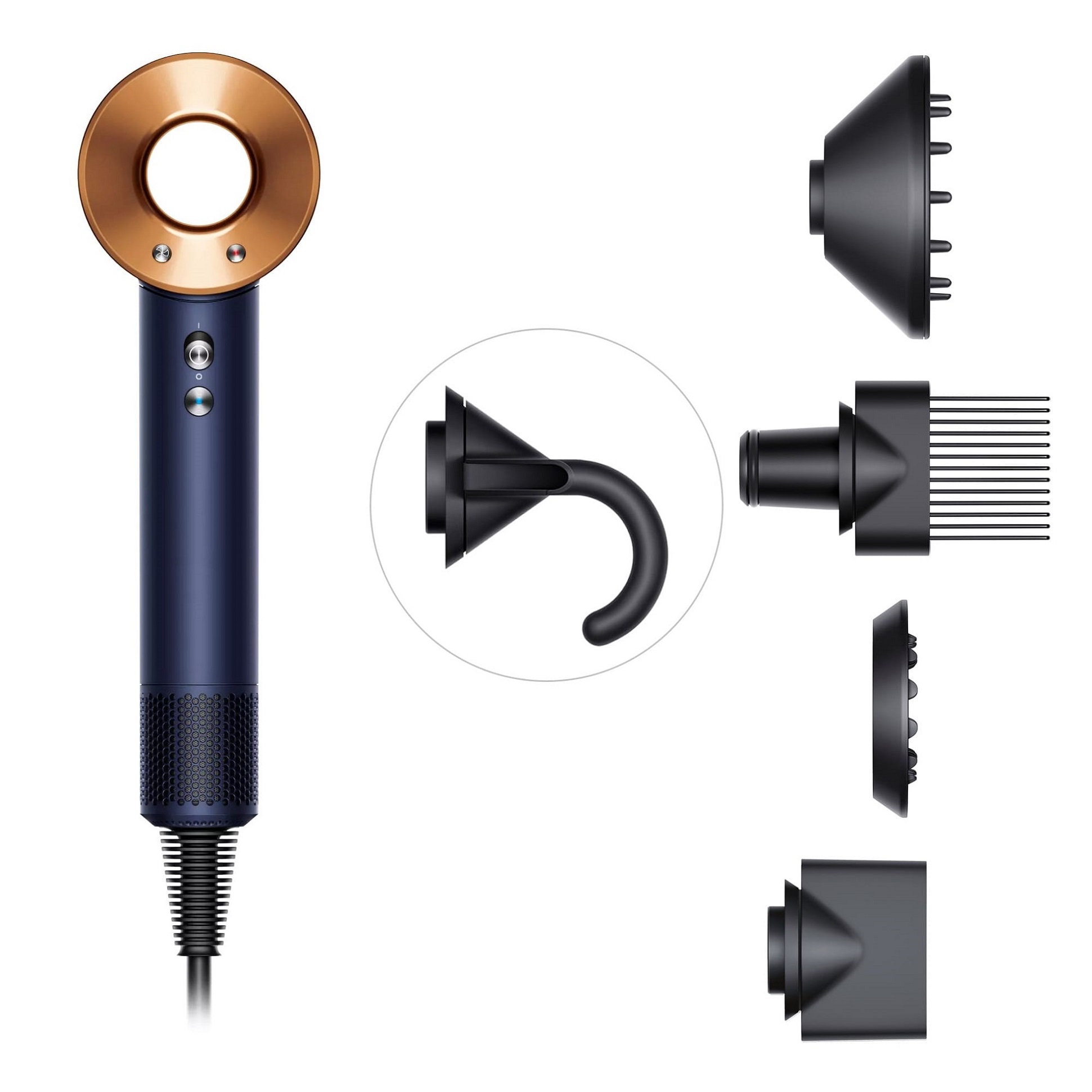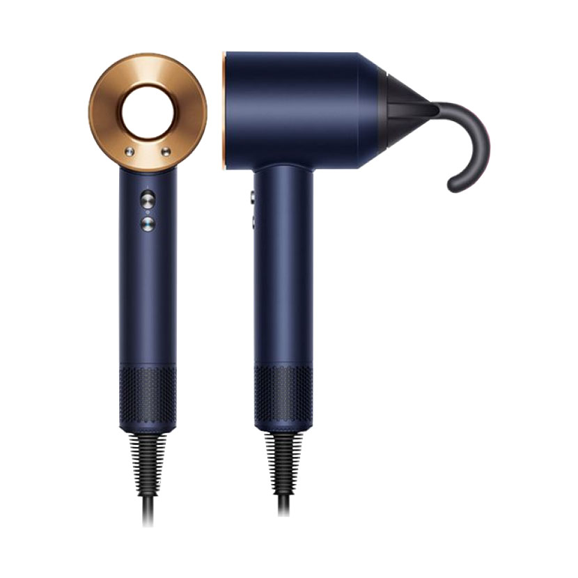 Фен-стайлер синего и медного цвета имеет стильный внешний вид и эргономичный дизайн. В комплекте пять насадок для создания разнообразных причесок. Устройство регулирует температуру, защищая волосы от повреждений. Также прилагается удобный чехол для путешествий.
