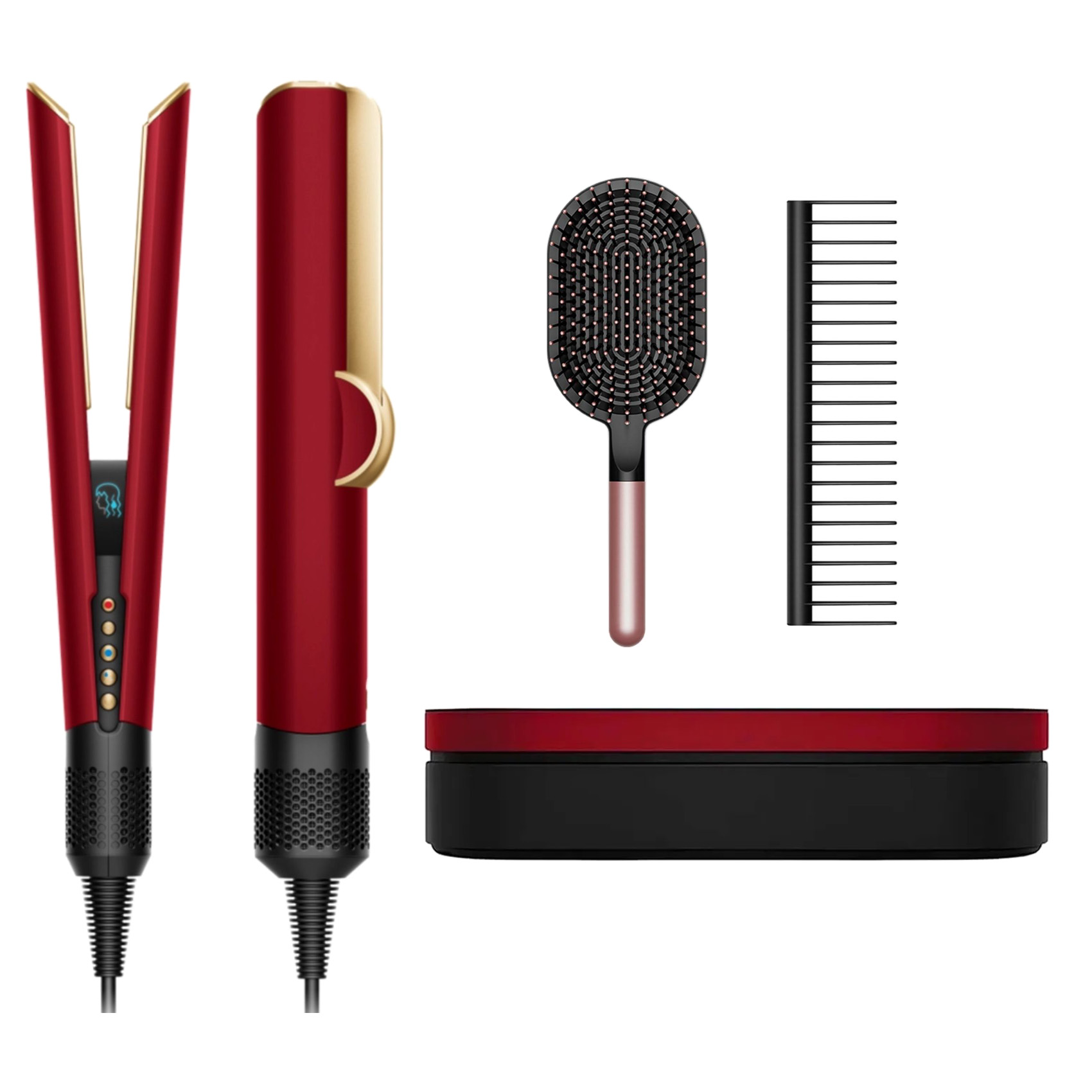 Этот прибор, выполненный в роскошном сочетании цветов «Красный бархат» и «Золото», предназначен для идеального выпрямления волос без риска перегрева. Он объединяет функции сушки и укладки, сохраняя естественный блеск и гладкость волос. Мощный воздушный поток гарантирует быстрый результат, не уменьшая объем прически. В комплект включен элегантный чехол-бокс для удобного хранения.